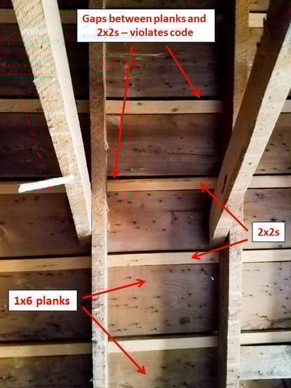 The customer had her roof replaced about 10 years ago and instead of re-decking the roof, the contractor filled the gaps between wood planks with 2x2s leaving a ¼ inch of space.